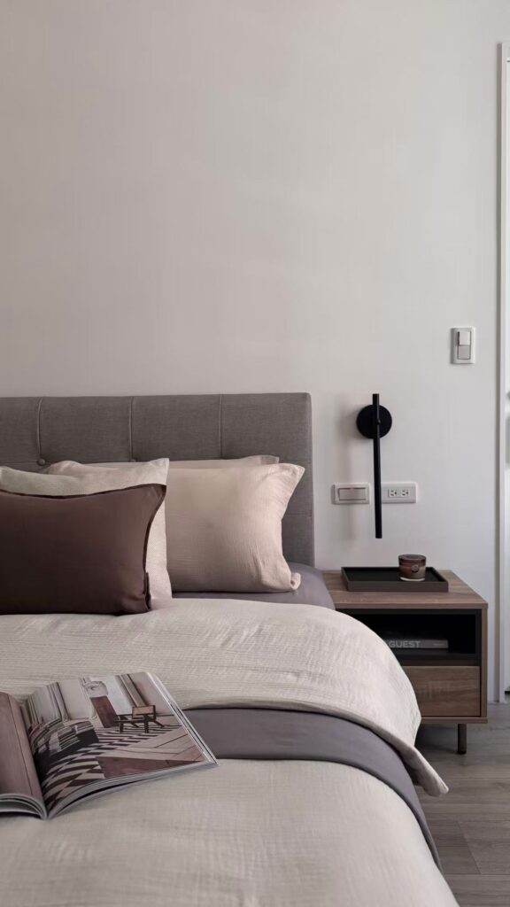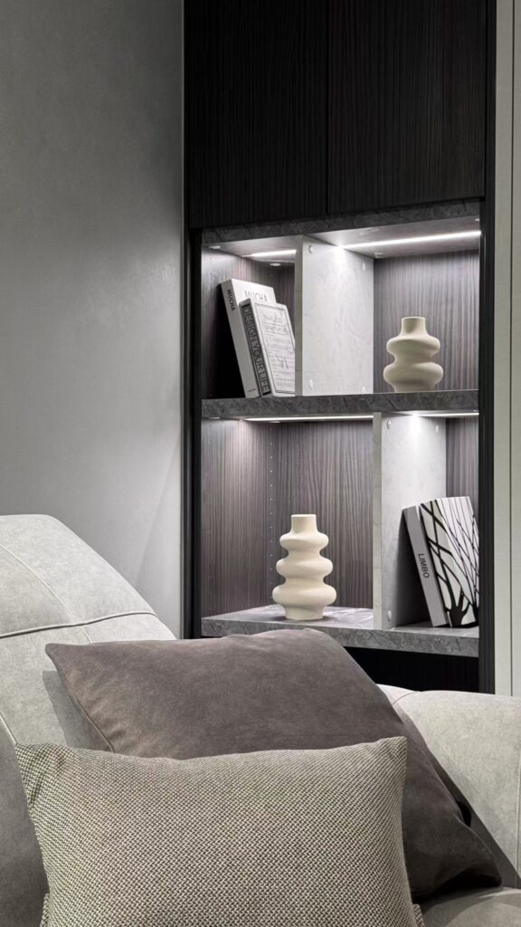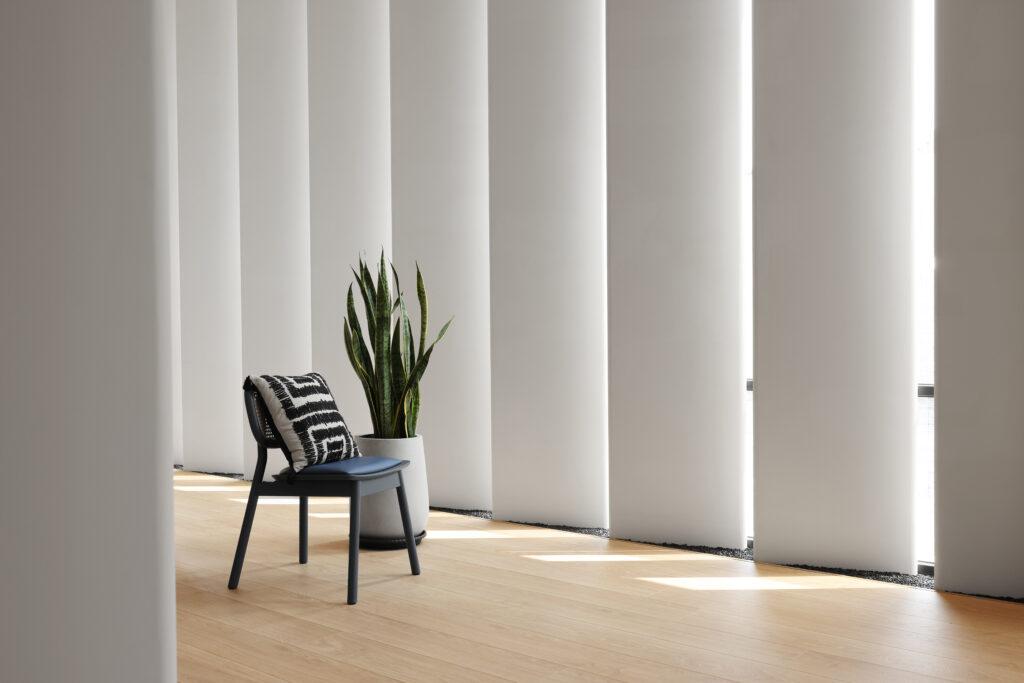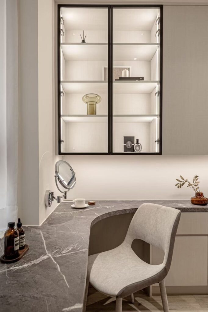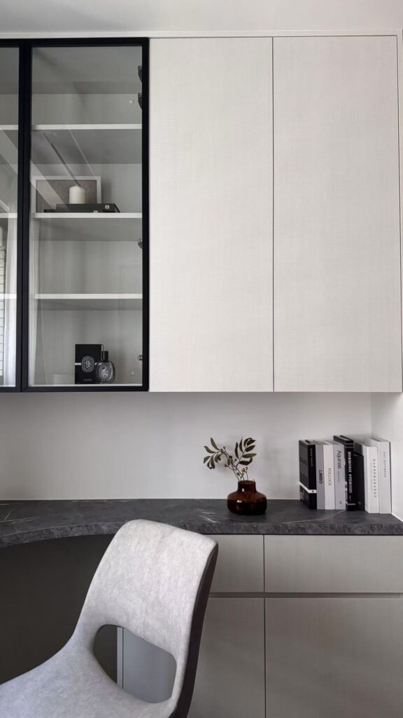 Elegant Scandinavian dining room with fruits, white furniture, and minimalist decor.